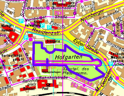 Blau: Große Runde, ca. 1,8 km: Jugendlauf 1 mal, Hofgartenlauf 5 mal zu durchlaufen